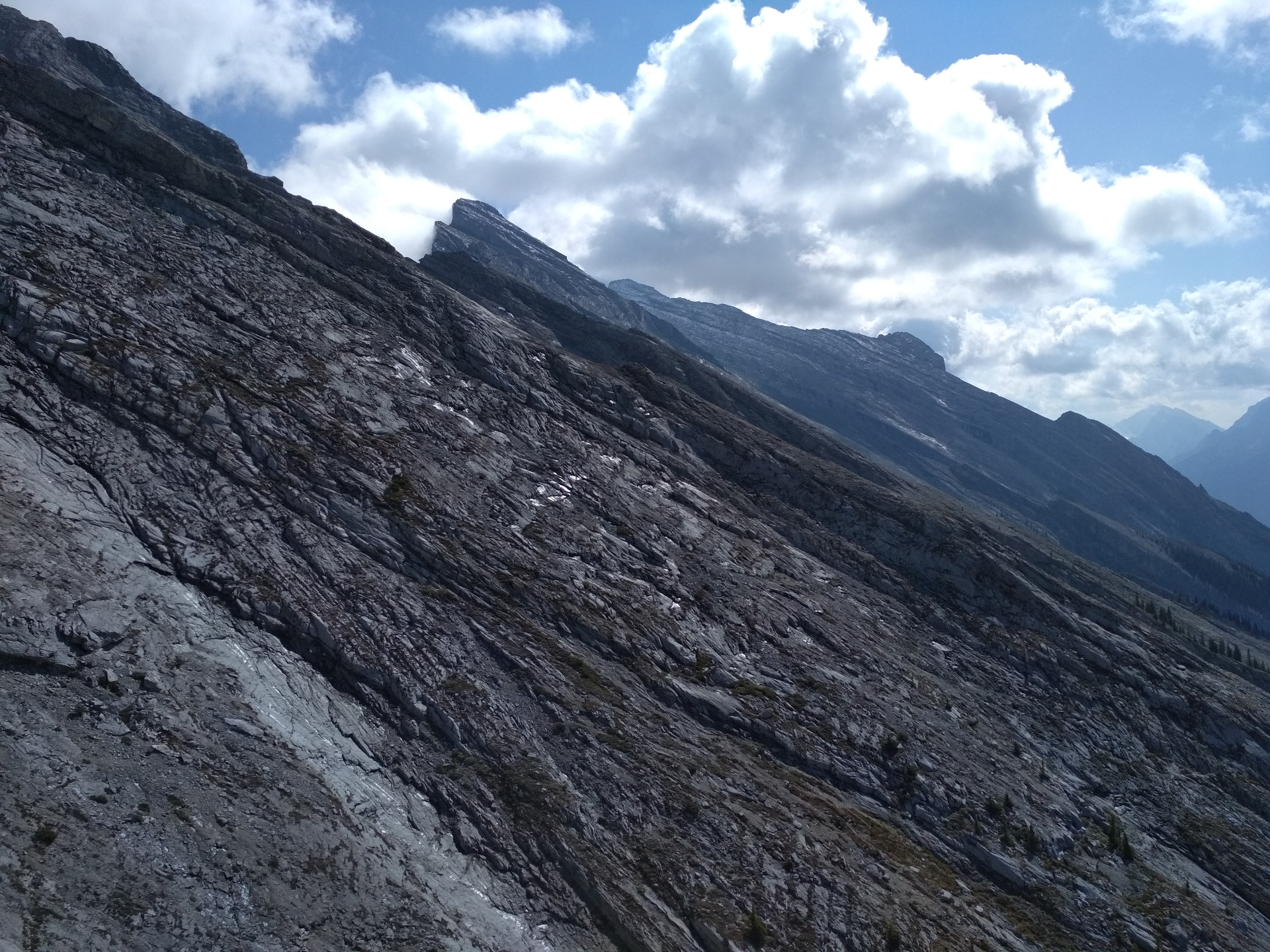 Takže po této skále jsme se šplhali nahoru. Pokaždé, když jsem si už říkal, že to nejhorší je za námi, přišla ještě horší pasáž hahah. V jedné chvíli dokonce nebylo pomoci a museli jsme na všechny 4 a šplhat protože to bylo prostě moc prudké a kluzké. Každopádně na fotce je vidět třetí vrchol hory Rundle, která má celkem vrcholů 8. Nejvyšší je vrchol 1 (na který právě stoupáme) a vrchol 3 (který je na obrázku, oba 2950 m.n.m.), ostatní vrcholy jsou o něco nižší. Vrchol 3 jde nádherně vidět až se vyšplháme úplně nahoru a je to opravdu pěkný pohled. No nic takže pokračujeme, zde za sebe nechám vyprávět příběh pořízené videa.